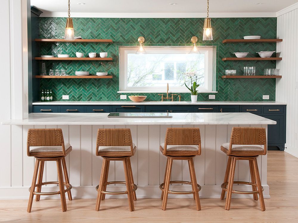The picture above shows a glossy leaf green 3×6 subway tile which brightens up the neutral wood cabinets.