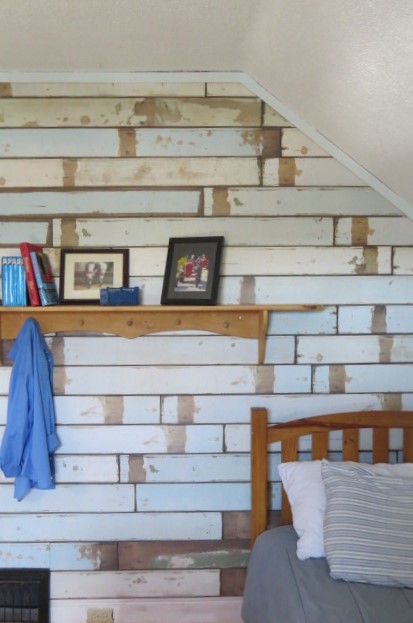 Leftover wood flooring or laminate is a great way to cover a wall. The wood that I used was called Beachhouse, which is sadly no longer made. But there are many, many styles of wood that can be used.