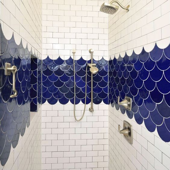Not only can you jive up your shower with colour and pattern, but incorporating two sets may be another way to individualize your bathroom. What do you think of the fishtail ‘stripe’ moving through the white subway tile?
