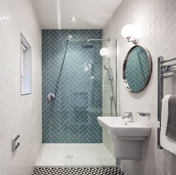 Throughout these bathrooms you can see hexagons, lengthy subway tiles, lanterns, fish scales AND some new shapes. Subway tiles, the most common go-to with homes, can be stacked vertically, horizontally or in a herringbone pattern. Directly below, while the main walls of the bathroom are white hexagons, the back wall of the shower is a herringbone pattern in blue. Above is a bold blue lantern tile surround, moving into a half wall around the sink.