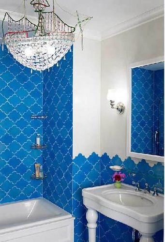 With the combination of blue and white so popular in bathrooms because of its relationship to water, incorporating a geometric pattern can take it up a notch. From tiles with a dot pattern built in (at top) to various shapes tiled together, there are many ways to accomplish this.