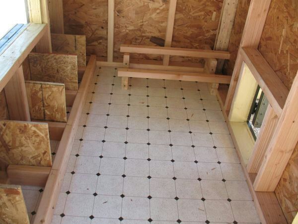 Putting a piece of sheet vinyl at the bottom of a chicken coop makes clean up so much easier! plus it adds a little bit of flair.