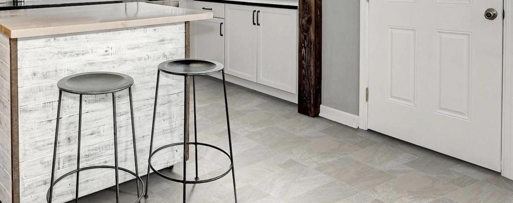 Kitchens are another great place to put sheet vinyl for many of the same reasons. Because sheet vinyl is softer underfoot, standing at the stove cooking is less likely to give you back pain. Like this vinyl floor from Tarkett….