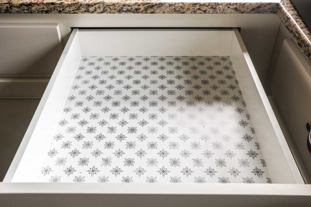 Putting a piece of vinyl in the bottom of your drawers or cabinets in kitchens and bathrooms ensures that and crumbs or moisture are caught, and will protect your drawers for years to come.