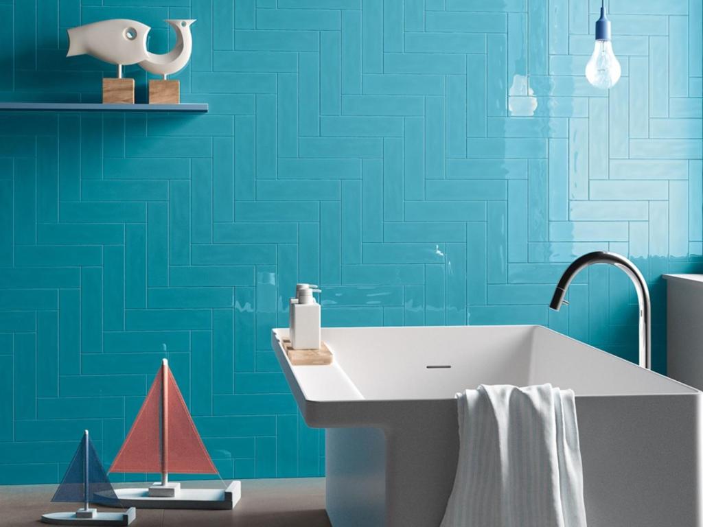 This wall shows tiles installed in a block herringbone, or straight herringbone. From Centura tiles, this is the tile line Slash in colour turquoise.